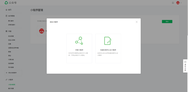1、公眾號(hào)后臺(tái),點(diǎn)擊“小程序管理”- 選擇“快速注冊(cè)并認(rèn)證小程序”,這樣注冊(cè)的小程序賬號(hào)會(huì)自動(dòng)認(rèn)證。